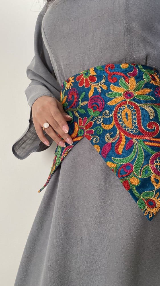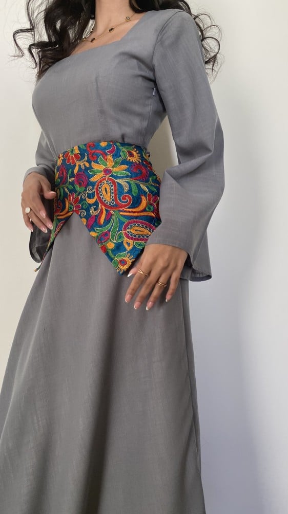 يأتي الفستان بقماش تفتة فاخر بلونه الرمادي الهادئ الذي يعكس الرقي والتميز ويتزيّن بحزام من قماش هندي مطرز بدقة مما يضيف لمسة فنية جمالية للأناقة البسيطة